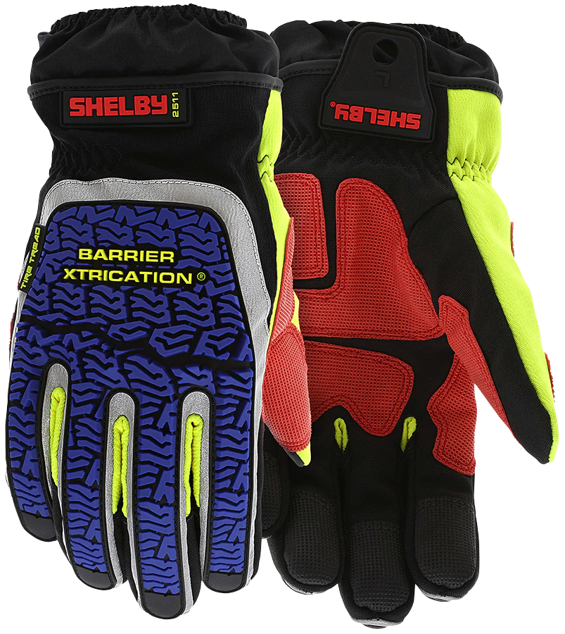 Shelby Xtrication® with Waterproof Barrier rescue gloves feature our patented multi-grade, tire tread TPR impact protection covering the back of hand and knuckles.